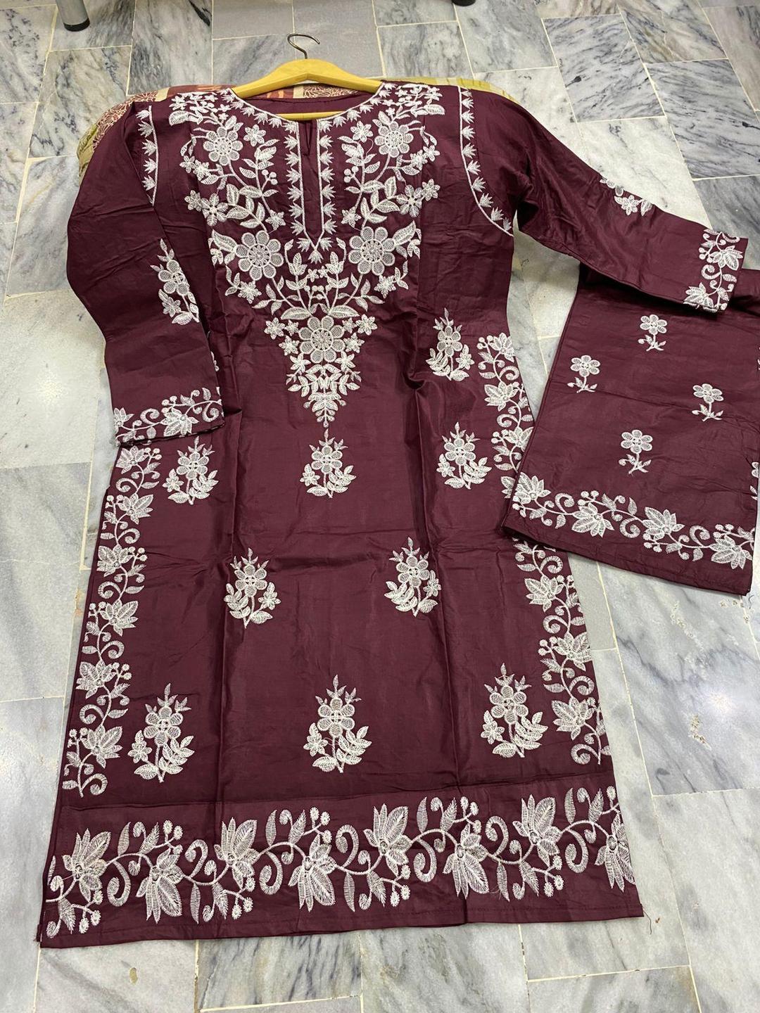Crafted from soft cotton, this beautiful maroon 2-piece suit blends traditional artistry with everyday comfort. Ideal for festive gatherings or daily wear, it features delicate Chicken Kari embroidery on the shirt, paired with a plain trouser for a balanced, graceful look.